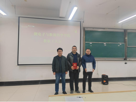 汪春胜向广大教职工介绍新任职的学院党委副书记、副院长、纪委书记张敏和新入职教师,并为获奖教师颁发获奖证书。并传达了学校《中共av在线看