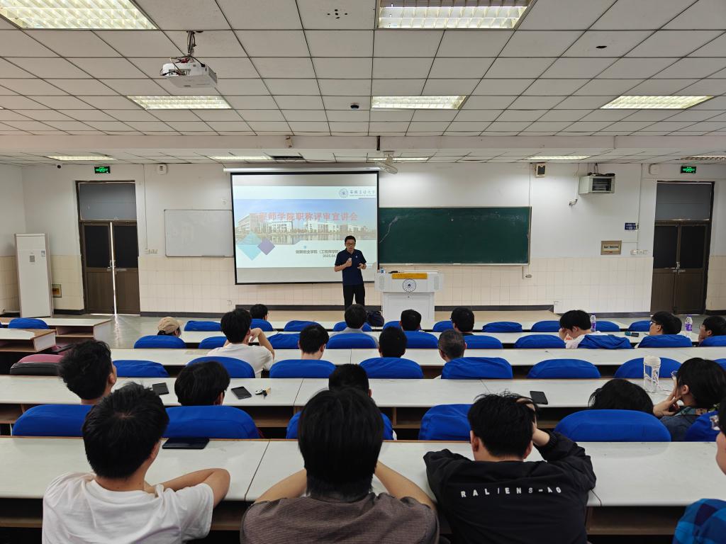 在阶教102召开2025届工程师学院职称评审宣讲会,系主任邓小龙、唐绪兵、杨辉及2025届毕业班同学参加会议,会议由毕业班辅导员张佳良主持。