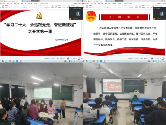 各团支部组织重温入团宣誓,让广大青年回忆起入团时的初心,燃起奋进新时代的热情,激发每位学生作为一名共青团员的光荣感和责任感。领誓人带领同学们面对团旗庄严宣誓,随后,团员代表分享了自己再次重温入团誓词的振奋和喜悦之情。同学们纷纷表示,要珍惜青春年华,锐意进取,不忘团员初心,不断砥砺前行。