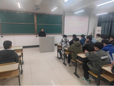 宣誓仪式在庄严的《国际歌》中拉开帷幕。张敏宣读学院党委关于党员发展和转正的批复。面向鲜红的党旗,全体新党员和老党员起立,在微电子本科生党支部书记张佳良的领誓下,举起右手,庄严宣誓,表达对党的忠诚、为共产主义事业奋斗终生的决心。随后,汪春胜、张敏以及各支部书记一一为新党员佩戴党员徽章。光电工程系党支部、教师许瑞醒作为新党员代表发言,表达了光荣入党的激动心情和锐意进取、无私奉献的决心。微电子本科生党支部、微C211班学生张超作为老党员代表发言,表达了对新党员的祝贺、回顾了入党的初心、提出了发挥模范作用的期冀。