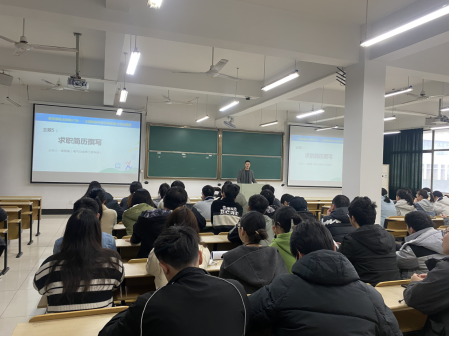 于数理楼403开展“简历制作+面试技巧”主题讲座,讲座特别邀请省级就业指导名师工作室成员、电气学院辅导员杨恒基传授简历制作技巧和规范,学院毕业班辅导员陈恳以及150多位毕业生到场聆听。