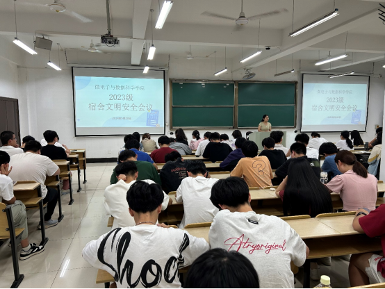 在数理楼403召开“以‘舍’为家,共‘寓’美好”宿舍文明安全会议。辅导员王小花主讲,各班纪律委员、2023级全体寝室长参会。