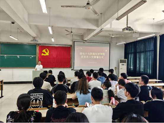 仪式在气势磅礴的《国际歌》中拉开帷幕。张敏宣读了学院党委关于党员发展和转正的批复。随后,汪春胜及各学生支部书记为新发展的预备党员佩戴党员徽章。全体新党员和老党员面向党旗庄严宣誓,誓言铿锵有力,表达了党员们对党的忠诚和为人民服务的决心。数据本科生党支部陈健平作为新党员代表发言,郑重承诺用实际行动践行初心使命。数学本科生党支部王紫焉作为老党员代表发言,对新党员予以祝贺,结合自身经历分享了入党后的成长感悟。