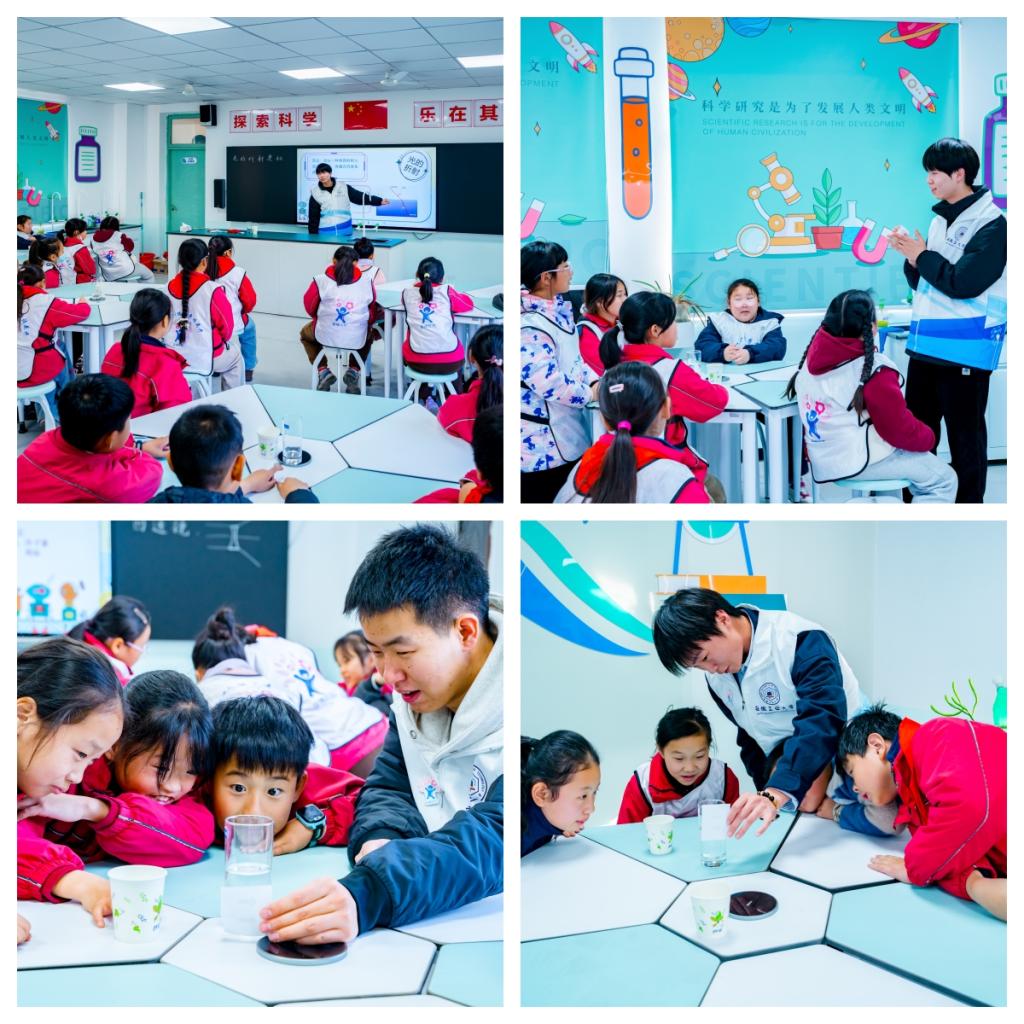 “数理行知”科普志愿队携手花山区金家庄街道“幸福花花”服务项目,走进新工房小学,以“光的折射”为主题开展科普活动。