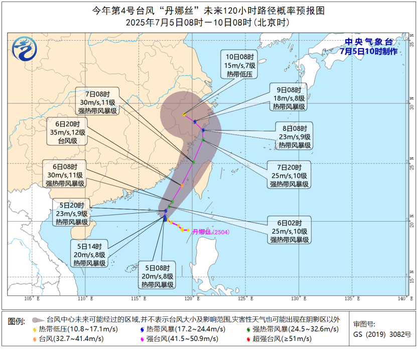 今年第4号台风“丹娜丝”今日7时位于台湾省高雄市西偏南方向约260km,中心风力12级(台风级),将以每小时10-15km的速度向东北方向移动,强度变化不大。今日夜间至明日早晨自南向北穿过台湾海峡,在此期间可能擦过或登陆台湾岛西部一带沿海,明日白天移入东海西南部海面,逐渐向福建北部至浙江中南部一带沿海靠近。